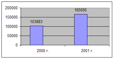 Рис. 7. Схема туристcких потоков Псковской области В Псковскую область прибыли иностранные граждане из 80 стран мира. Основную часть въездного потока (71%) традиционно составили граждане Латвии, Эстонии и Литвы. Значительно возрос въездной поток иностранных граждан из Эстонии. Только поток иностранных туристов из Эстонии в 2001 г. увеличился в 4 раза. Каждый второй гражданин Эстонии въезжает в Российскую Федерацию с туристскими целями через Псковскую область. Статистические данные о пересечении российско-латвийской границы практически остались на уровне 2000 г. В 2001 г. в Псковскую область въехало 263195 граждан Латвии. В 2001 году в Латвию и Эстонию выехало 277039 российских граждан, в т.ч. в Латвию - 198030 чел. С целью туризма выехало 50514 чел., в т.ч. в Эстонию - 1454 чел., в Латвию - 49060 чел. [43]. Отмечено снижение въездного потока иностранных граждан (особенно с деловыми визитами) из стран, с которыми Россия не имеет общих границ. Данная тенденция является общей по Российской Федерации. Снижение поездок с деловыми целями из стран дальнего зарубежья составило 7,1%. В то же время увеличился въезд граждан Норвегии (на 27%), Финляндии (на 17%), Швеции (на 10%). Из Прибалтики увеличился въездной поток граждан Украины (на 64%), Польши (на 59,2%). Поток туристов из данных стран имеют положительные темпы роста и по Российской Федерации.[42] Основной въездной и выездной поток иностранных граждан следует через Псковскую область транзитом (въехало через границу 553605 иностранных граждан, а останавливались в гостиницах граждан СНГ 7376 чел, иностранных граждан - 6906 чел.).[42] В 2001 году в Псковской области на предприятиях размещения останавливалось 165695 чел. По сравнению с 2000г. (103883 чел.) рост составил 38%, графически это соотношение представлено на рис. 8. Основная часть проживающих являлась гражданами России (91 %) [42]. По туристским путевкам было обслужено 67328 чел., что составляет на 48% больше, чем в 2000г. (34443 чел.) (рис. 9). Основная часть туристов воспользовалась путевками для размещения на туристских базах (48%), гостиницах (33%), санаториях (19 %) [42]. Количество детей составило 20% от общего потока [42]. Основная часть детей прибывала в Псковскую область с целью отдыха. Непосредственно туристские фирмы (в количестве 23-х, имеющие лицензию на международную туристскую деятельность) Псковской области в 2001 г. приняли 31618 чел, что составило 20% от общего количества человек, проживающих на предприятиях размещения.
