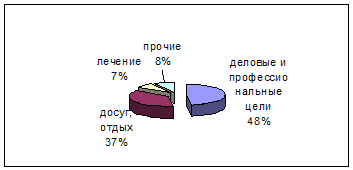 В 1998 году по въездам в Россию лидировала Польша. В 1999 году она уступила свою позицию в рейтинге Украине даже при увеличении числа туристов на 61,8 % (373,7 тыс. чел.). Число прибытий по турвизам из Украины увеличилось в 19,4 раза, или до 2237,2 тыс. чел. [42] Из Литвы поток туристов увеличился на 22,2 % (11,5 тыс. прибытий), Латвии – на 34,9 % (12,4 тыс.), Эстонии – на 89,7 % (18,8 тыс.) [42]. Кроме стран Балтии можно отметить рост числа туристических прибытий из Японии на 13,9 % (2326 человек), Швеции – 5,7 % (897), Израиля – на 11,5 % (1457), Южной Корее на 48,4 % (3809) [42]. 1.2. Классификация видов туризма и факторов, влияющих на развитие туризма Классификация в туризме обозначает выявление его отдельных форм и видов в зависимости от основного показателя - критерия. Как всякая другая классификация, классификация видов туризма помогает более досконально изучить развитие туризма, его видоизменения и основные тенденции. Но туризм сложное и многоплановое понятие. Очень сложно выделить формы и виды туризма в их чистом виде, поэтому нет в мире единой классификации. Те, что существуют, имеют некоторые расхождения, но в целом между собой согласуются. Туризм можно классифицировать по разным критериям [19;126]: 1. По цели поездки. Этот критерий имеет решающее значение, потому что именно цель поездки больше всего влияет на формирование тура и организацию туристического обслуживания. Путешествуя, турист может ставить перед собой несколько целей, но только одна из них будет доминирующей. В зависимости от цели отличают следующие туризма: a) Познавательный или культурно-развлекательный. Включает поездки людей в целях ознакомления с природными, историко-культурными достопримечательностями, музеями, театрами, общественным строем, жизнью и традициями народов в посещаемой стране. Познавательные цели могут совмещаться с целью отдыха. b) Деловой. В основе этого вида туризма лежит необходимость выполнения служебных или профессиональных задач. Поездки с деловыми целями рассматриваются как одна из важнейших составных частей современного туристического обмена. К деловому туризму относятся поездки делегаций или отдельных лиц для участия в международных переговорах, совещаниях, праздниках, коронациях, церемониях вступления в должность глав государства и правительств. Но в число туристов не включаются дипломатические работники посольств и консульств, сотрудники торговых представительств и других организаций, которые работают за границей. К разновидности делового туризма относятся поездки для участия или посещения национальных и международных выставок и ярмарок, поездки в составе специализированных групп по профессиям. За последние годы спрос на такие поездки постоянно растет. По своему характеру они приближаются к познавательным поездкам, но специальная программа посещения различных объектов и предприятий, а также однородный профессиональный состав группы предопределяет целесообразность выделения таких поездок в отдельную разновидность такого туризма. Развитие делового туризма в первую очередь связанно с интернационализацией бизнеса, который в последнее время захватывает крупнейшие компании мира. c) Этнический. Цель этого туризма - посещение родственников, места рождения своего или родителей. Особое значение данный вид туризма имеет для стран, часть населения которых проживает за границе