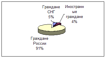 Рис. 11. Характеристика проживающих по продолжительности проживания Из рис. 12 можно отметить, что доля прибывающих в Псковскую область иностранных граждан очень мала, основную массу приезжающих составляют граждане России.