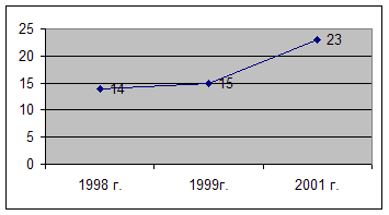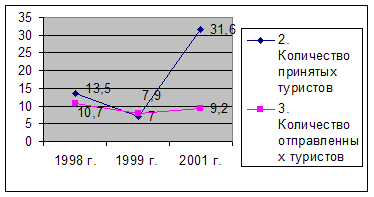 Для наглядности выше указанные показатели представлены в виде графиков на рис. 13-15. Из рис. 13 видно, что количество фирм, имеющих лицензию на международную туристскую деятельность в период с 1998 по 2001 гг. значительно увеличилось.