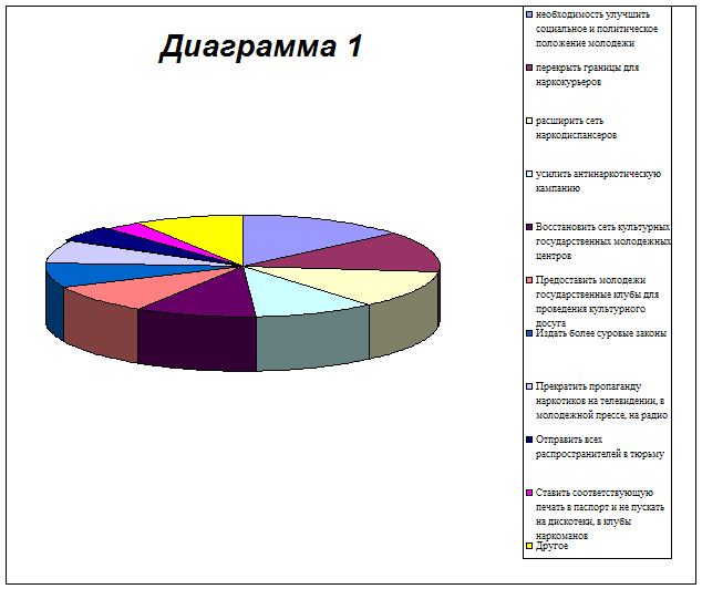 Отсюда видно как важно наличие не только законов против наркомании и борьба с ней, а так же профилактика и предоставление альтернативных видов досуга, таких как спорт, культурно-массовые мероприятия и другое. А главное, что такую взаимосвязь улавливает и сама молодежь, и делает для себы выводы о собственных возможностях проводить свободное время и о предоставленных возможностях, из которых сложно пока что-то выбрать. Это видно и из Диаграммы 2, которая описывает методы борьбы с наркоманией и юношеским алкоголизмом, предлагаемые зрелым населением.