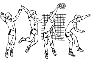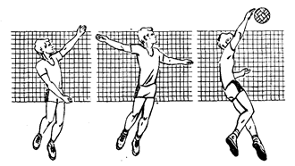 Рис. 7 Нападающие удары. В игре в волейбол используются прямой, боковой нападающие удары и удары с поворотом кисти и туловища. Прямой нападающий удар характеризуется сочетанием сложных по координации движений (рис. 7). Подготовка к выполнению прямого нападающего удара осуществляется за счет ускоренной ходьбы, переходящей в бег. Ритм разбега существенно зависит от скорости и траектории передачи мяча для выполнения нападающего удара. Длина разбега составляет 2‑3 шага и скачок. В скачке стопа вынесенной вперед ноги ставится на пятку (стопорящий шаг), вторая нога приставляется к первой, выпрямленные руки отводятся назад. Отталкивание от опоры начинают с махового движения руками по дуге сзади‑вперед‑вверх еще до активного разгибания ног. В волейболе прыжок вверх, как правило, максимально высокий, поэтому игрок должен оттолкнуться как можно сильнее. Одновременно со взлетом игрок выполняет замах бьющей рукой вверх‑назад, прогибается в груди и пояснице, ноги слегка сгибает в коленных суставах, правое плечо (если правая рука ударная) отводит назад, левую руку, незначительно сгибая в локтевом суставе, отводит вверх‑в сторону. В момент удара по мячу бьющая рука выпрямляется в локтевом суставе, растянутые при замахе мышцы живота, груди и руки резко сокращаются. Рука выпрямляется, кисть накладывается на мяч в расслабленном состоянии, удар выполняется в определенном направлений. После удара по мячу игрок приземляется на согнутые в коленных суставах ноги и на переднюю часть стоп.