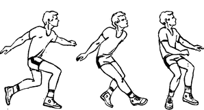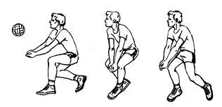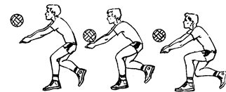 Рис. 9 Прием мяча снизу двумя руками. Мячи, летящие на уровне пояса (или ниже пояса), принимаются, как правило, снизу двумя руками. При этом кисти рук соединены вместе и вынесены вперед. При приближении мяча игрок разгибает ноги, туловище поднимает несколько вверх и вперед. Удар по мячу выполняют предплечьями, затем руки смещают вперед‑вверх за счет выпрямления туловища и разгибания ног (рис. 9). Прием мяча снизу одной рукой. Одной рукой принимаются мячи, летящие далеко от игрока, после предварительного передвижения игрока. Ударное движение выполняется напряженной кистью. Большое значение для успешной игры в защите имеет прием мяча снизу одной рукой в падении вперед или в сторону с последующим скольжением на груди и животе. Выполняя выпад вперед, а затем толчок ногой игрок посылает туловище вниз‑вперед, руки для предстоящего махового движения несколько отведены назад. Одновременно с толчком нога, расположенная сзади, маховым движением выносится вверх, туловище игрока перемещается вперед‑вверх, угол его наклона к горизонтали увеличивается. Удар по мячу осуществляется в полете тыльной стороной ладони или кулаком. После удара по мячу игрок вытягивает руки вперед и разводит в стороны несколько шире плеч. При приземлении на руки амортизация осуществляется главным образом уступающим движением пояса верхних конечностей. Туловище прогибается в пояснице, опускаясь вниз‑вперед до соприкосновения груди и живота с площадкой. Приземление сопровождается скольжением туловища по площадке, подбородок при этом отклоняется несколько назад. Очень эффективен прием мяча снизу одной рукой в падении с выполнением кувырка через плечо после удара по мячу. Блокирование. Определив направление и высоту передачи мяча для нападающего удара, игрок передвигается к предполагаемому месту встречи с мячом приставными шагами, скачком или медленным бегом. При этом ноги его незначительно согнуты в коленных, а руки - в локтевых суставах, кисти находятся на уровне головы. Перед блокированием игрок сильнее сгибает ноги в коленных и голеностопных суставах, ноги на ширине плеч, а предплечья согнутых рук, поднимаются несколько выше головы. При блокировании нападающих ударов, выполняемых после обычных передач, игрок отталкивается от опоры в тот момент, когда нападающий находится в безопорном положений. Определив действия нападающего, блокирующий отталкивается от опоры, при этом движение начинается руками, а затем ногами. Резким разгибанием ног, выпрямлением туловища и энергичным махом руками игрок принимает вертикальное положение.