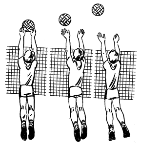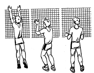 Рис. 10 Руки выносятся над сеткой так, чтобы предплечья имели небольшой наклон по отношению к сетке, пальцы рук разведены несколько меньше диаметра мяча и оптимально напряжены. При приближении мяча руки перемещаются вперед‑вверх в сторону соперника. Одновременно кисти сгибаются в лучезапястных суставах и пальцами выполняется движение вперед‑вниз. После блокирования игрок приземляется на согнутые ноги (рис. 10). Описанные выше движения касаются техники выполнения неподвижного блокирования. Подвижное блокирование аналогично неподвижному. Если для неподвижного блокирования руки выставляют над сеткой с целью прикрытия определенной зоны площадки, то при подвижном игрок перемещает руки вправо или влево, в зависимости от направления нападающего удара. Если удары блокируются с краев сетки, ладонь руки, ближней к краю, разворачивается внутрь так, чтобы при ударе в блок мяч отскочил на площадку соперника. Техника блокирования нападающих ударов, выполняемых после различных передач, почти аналогична описанной выше. Исключение составляет момент отталкивания от опоры, который соотносится с началом безопорной фазы нападающего. Техническая подготовка направлена на обучение техники движений и ее совершенствование, служащей средством ведения соревновательной борьбы. Для создания наиболее благоприятных условий с целью изучения приемов игры, обучение следует строить по такому плану: 1. Общее ознакомление с приемом игры. 2. Выполнение приема в упрощенных условиях. 3. Выполнение приема в условиях, приближенных к игровым. 4. Совершенствование приема в игровой ситуации. Ниже приводятся примерные упражнения для технической подготовки юных волейболистов. Передвижения 1. Занимающиеся располагаются за лицевой линией площадки и принимают положение обусловленной стойки игрока. По определенному сигналу (зрительному или слуховому) передвигаются двойным или приставным шагом, скачком или выпадом (вправо, влево, в стороны). 2. Занимающиеся располагаются в шеренгах за лицевой линией. По определенному сигналу они выполняют передвижения бегом к сетке, затем спиной вперед обратно. То же, но с имитацией определенного приема игры. 3. Занимающиеся располагаются в двух колоннах в зонах 1 и 5 (Рис.2). По сигналу бегут в зону 6, останавливаются и имитируют определенный прием игры. 4. Расположение в шеренгах. Стартовые ускорения вперед, вправо, влево из различных положений: сидя лицом и спиной к направлению передвижения; лежа на спине и на животе головой и ногами в том же направлении. 5. Расположение в колонне по одному за лицевой линией. Первый игрок из зоны 1 выполняет ускорение в зону 2, откуда передвигается вдоль сетки приставными шагами в зону 4, а затем спиной вперед, назад в зону 5. Из зоны 5 игрок передвигается в зону 6, где выполнив остановку и имитацию приема мяча снизу двумя руками, уходит в конец колонны. 6. Расположение то же, что в упражнении 5. Первый игрок выполняет ускорение в зону 6, имитирует прием мяча снизу одной рукой, затем передвигается в зону 2, где имитирует нападающий удар. Из зоны 2 возвращается спиной вперед в зону 6, откуда, подбежав в зону 4 к сетке, выполняет блокирование, снова передвигается спиной вперед в зону 6 и уходит в конец колонны. Для того чтобы лучше усвоить технику выполнения передвижения, рекомендуется использовать различные подв