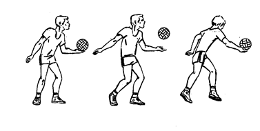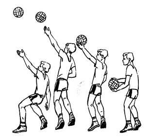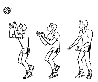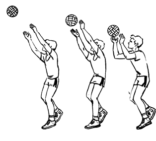 Рис.5. Передачи. В игре применяются передачи мяча сверху двумя руками, находясь в опорном положений, в прыжке и с падениями. Передача сверху двумя руками. В исходном положений туловище игрока расположено вертикально, ноги на ширине плеч или одна нога несколько впереди. Степень сгибания ног зависит от высоты траектории полета мяча. Руки выносятся перед лицом, кисти рук оптимально напряжены. С приближением мяча игрок начинает встречное движение выпрямлением ног, туловища и рук. При выполнении ударного движения в момент соприкосновения с мячом пальцы рук сначала амортизируют встречный полет мяча, затем кисти и пальцы рук упруго и эластично выпрямляются, придавая мячу новое поступательное движение. Указательные и средние пальцы являются основной ударной частью, безымянные и мизинцы удерживают мяч в боковом направлении. Сообщение мячу нового направления с определенной траекторией требует увеличения мышечных усилий, что проявляется в согласованном движении ног, туловища и рук (рис. 6). При передаче назад игрок поднимает руки, располагая их тыльной стороной кистей над головой, разгибает ноги, отклоняет туловище вверх-назад. Передача выполняется за счет разгибания рук в локтевых суставах и движения туловища назад-вверх, с одновременным прогибанием в грудной и поясничной частях позвоночного столба.