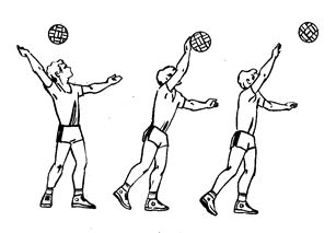 Рис.6. В том случае, когда мяч летит высоко и направлен за игрока, выполняется передача сверху двумя руками или одной в прыжке. Во время прыжка руки выносятся над головой несколько выше, чем при передаче в опоре. Отталкиваясь от опоры, игрок поворачивает руки вверх и выполняет передачу в высшей точке прыжка. При передачах мяча в прыжке назад за голову техника движении остается такой же, как и при передачах из опорного положения. Передачи мяча сверху двумя руками в падении с перекатом на спину, с падением на бедро‑спину применяются тогда, когда мяч летит прямо на игрока или в стороне от него.