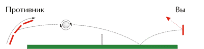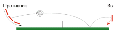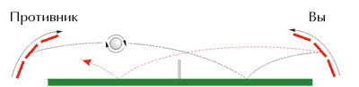Если закрученный мяч после наката попадет на вертикально расположенную ракетку, то он отскочит вверх (рис. 1). Рис. 2Чтобы скомпенсировать кручение, и правильно отбить мяч следует накатить (рис. 2). 2.4 Подрезка Чтобы подрезать, нужно во время контакта с мячом вести ракетку сверху вниз. После подрезки мяч поднимается вверх, поэтому чем сильнее вы закрутите мяч, тем дальше он будет улетать. Подрезка считается оборонительным ударом. С подрезанного мяча сложнее атаковать. Подрезка Открытой Ракеткой (справа) Выполнение удара. В исходном положении игрок стоит почти лицом к столу, слегка выставив вперед левую ногу, рука делает замах назад-вверх и затем идет вперед-вниз. В момент удара мяча о ракетку, которая обращена открытой стороной вверх, рука слегка согнута. После удара ракетка немного сопровождает мяч и затем уходит влево-вперед вниз. Сила удара при подрезке существенно зависит от встречной скорости мяча и расстояния от стола, на котором его принимают. Подрезка Закрытой Ракеткой (слева) Исходная стойка типична для игры слева: правая нога немного впереди, туловище чуть повернуто влево. Движение руки, сильно согнутой в локте и отведенной налево-вверх-назад для замаха, происходит сначала вперед-вниз, причем на этом этапе рука в локте не разгибается. В процессе движения туловище немного поворачивается и центр тяжести переносится на правую ногу.