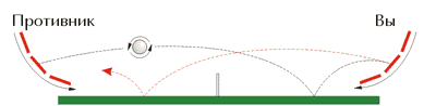 Если закрученный мяч после подрезки попадет на вертикально расположенную ракетку, то он отскочит вниз (рис. 3). Рис. 4 Чтобы скомпенсировать кручение, и правильно отбить мяч следует подрезать (рис. 4). 2.5 Топ-спин Назначение этого атакующего приема - придать мячу сверхсильное верхнее вращение. Скорость его намного больше, чем при накате, что очень усложняет сопернику ответные действия. Во-первых, самым неожиданным бывает отскок мяча от стола. Во вторых, даже уже принятый ракеткой мяч остается непослушным, и направить его по задуманному направлению очень и очень не просто. Хорош топ-спин и потому, что сильно закрученный мяч высоко пролетает над сеткой и это придает смелости атакующему. Считается, что применять топ-спин можно всегда, но практика показывает, что это не так. Топ-спин справаДля топ-спина характерен большой замах, как правило вытянутой рукой. Выпрямление ее в начале движения позволяет увеличить и сам замах, и скорость ракетки с помощью усилия предплечья и кисти. Движение руки при топ-спине в отличие от удара накатом почти полностью направлено вверх, а удар по мячу носит скользящий характер. Исходная стойка: левая нога чуть выдвинута вперед, правая рука выпрямлена и отведена за спину вправо-назад. Туловище развернуто в правую сторону, чтобы увеличить замах. Ноги согнуты в коленях, все тело расслаблено. Топ-спин начинается с активного поворота в направлении удара. Правая рука идет вперед-влево-вверх. Вес тела переносят с правой ноги на левую. По инерции туловище и рука могут даже уходить далеко влево. В момент соприкосновения с мячом ракетка должна как бы скользнуть по нему. При этом сила прямого удара мяча о ракетку минимальна. Однако кисть придает ему заключительное ускорение. Есть еще вариант топ-спина справа, который называют боковым. Разница в выполнении прямого топ-спина и бокового заключается в том, что руку с ракеткой заводят к мячу сбоку, кисть опущена чуть больше. Топ-спин слеваПрактикуется