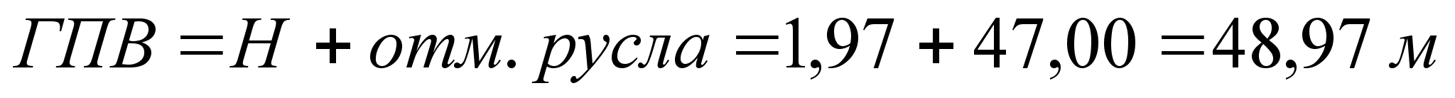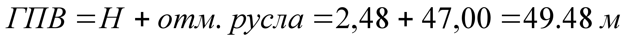 4.3 Определение горизонта подпертых вод, Горизонт подпертых вод (ГПВ) у малого моста можно найти как сумму напора воды перед мостом и отметки русла лотка. Тогда значение ГПВ будет равно: