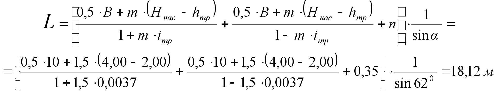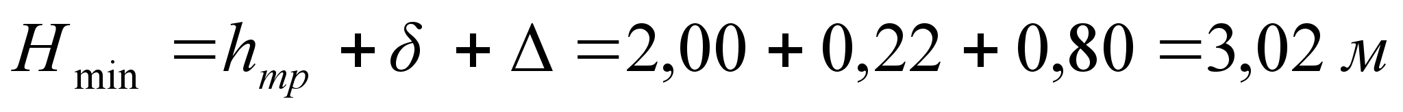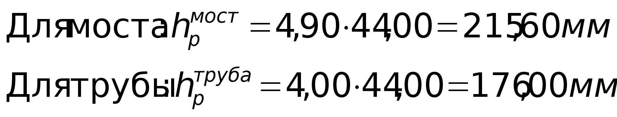 где B – ширина земляного полотна для IV категории, равная 10 м; m – коэффициент заложения откосов насыпи, равный 1,5; Hнас – высота насыпи у трубы, равная 4,00 и определяемая по продольному профилю, при условии, что она должна быть больше или равна минимальной высоте насыпи Hmin, определяемой в п. 3.4; hтр – высота трубы в свету, равная 2,00 м; iтр – уклон трубы, принимаемый равным уклону лога у сооружения (табл. 1.1 курсовой работы), равный 0,004 тыс.; – угол между осью дороги и осью трубы, равный 620. 3.4 Назначение минимальной высоты насыпи у трубы. Минимальная толщина засыпки труб установлена =0,5 м, но так как толщина дорожной одежды hдо= 0,80 м, принимаем = 0,80 м.