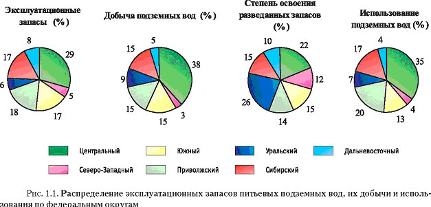 Реферат: Ресурсы и качество подземных водРеферат: Ресурсы и качество подземных водПрогнозные ресурсы подземных вод составляют более 869 млн. м3/сут и в основном формируются в бассейнах Волги (116,46 млн. м3/сут) и Оби (282, 35 млн. м3/сут) - около 46% от общего количества по России. Свыше 77% (670 млн. м3/сут) сосредоточено в Северо-Западном, Уральском, Сибирском и Дальневосточном федеральных округах, при этом наибольшая часть (29%) - на территории Сибирского федерального округа. На территории Российской Федерации разведано 4483 месторождения подземных вод, в эксплуатации находится 1990. Общее количество разведанных эксплуатационных запасов под земных вод, пригодных для хозяйственно-питьевого, производственно-технического водоснабжения, орошения земель и обводнения пастбищ составляет 89,4 млн. м3/сут, в том числе подготовленных для промышленного освоения (по категориям А+В+С1) - 80,4 млн. м3/сут. Общая добыча подземных вод составляет 28,15 млн. м3/сут, в том числе на участках с разведанными запасами - 15,32 млн. м3/сут, или 54,4%, на неутвержденных запасах подземных вод - 12,83 млн. м3/сут. Наибольшим количеством разведанных месторождений и эксплуатационных запасов подземных вод располагает Центральный федеральный округ - 1119 (25%) и 26,12 млн. м3/сут (29%) соответственно. По федеральным округам (рис. 1.1) количество разведанных месторождений варьирует от 416 (Северо-Западный) до 749 млн. м3/сут (Сибирский федеральный ок руг), эксплуатационные запасы - от 4,5 (Северо-Западный) до 15,9 млн. м3/сут (Приволжский федеральный округ).