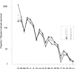 (Opx1) Парагенезис II, включающий кислый-средний плагиоклаз (Pl1) и биотит (Bi) либо роговую обманку (Hbl1), кристаллизовался из риодацитового расплава. Кристаллизация происходила в камере, по геофизическим данным находящейся на глубине 23-40 км. В очаг кислой магмы произошло поступление более основного расплава (андезитового с парагенезисом I), и последовало смешение этих расплавов. В качестве кислого конечного члена можно предполагать позднеплиоценовые риодациты г.Тузлук докальдерного цикла, составы которых приведены в табл. 9. На рис. 9 показаны средние составы вулканитов изученных толщ и риодацитов Тузлука и трахиандезитов Худеса и Таш-Тебе. Как видно, распределение микроэлементов в дацитах Эльбруса имеет тот же характер, что и в конечных членах, а уровни их содержаний - промежуточные между таковыми в конечных членах. Как показывают балансовые расчеты методом наименьших квадратов, для образования гибридных дацитовых составов, при смешении риодацитовых (соответствующих риодацитам г. Тузлук) и трахиандезитовых (соответствующих трахиандезитам Худеса и Таш-Тебе) расплавов, при формировании риодацитов первой толщи доля трахиандезитового расплава должна составлять 20%, при формировании дацитов второй толщи 61%, третьей - 62%, четвертой - 68%. Таким образом, в ходе эволюции доля основного расплава, участвующего в смешении, возрастает. Общий источник риодацитов и трахиандезитов, очевидно, отражает подобный вид распределения микроэлементов в них (рис. 9), и процесс в целом носит характер смешения родственных расплавов. Таблица 9 Химический состав риодацитов Тузлука и трахиандезитов Худеса и Таш-Тебе (оксиды в мас.%, элементы в г/т)