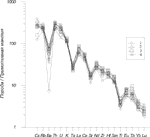 Химический состав изученных пород (табл. 1, 2) отвечает риодацитам, дацитам и трахидацитам. Основные петрохимические особенности составов и геохимические параметры пород (рис. 3) близки к гранитоидам орогенного I-типа [33; 36; 25]. Повышенное содержание Na и К (в сумме их оксиды составляют 6,83-8,15%) и достаточно высокие отношения K2O/Na2O приближают породы к калиевым субщелочным разностям. О субщелочной тенденции в составе пород свидетельствуют повышенные концентрации титана (до 1,0% TiO2) и фосфора (до 0,30% P2O5) (табл. 1), по сравнению со средними составами гранитов I-типа [25], при этом повышенные концентрации высокозарядных элементов (Zr), а также РЗЭ, Ba, и несколько пониженные содержания Rb, являются признаками гранитоидов латитового типа [27]. Как отмечено выше, вулканиты кальдерного и посткальдерного комплексов сложены четырьмя последовательными вулканическими толщами. Первая, наиболее ранняя толща, представлена риодацитами, три последующих - дацитами (табл. 1). Вулканиты второй толщи отличаются повышенными содержаниями P, Ti, Cr, Sc, Co и РЗЭ, пониженными концентрациями К и, отчасти, Rb (табл. 1, 2). Таблица 1 Химический состав вулканитов Эльбруса (мас.%)