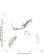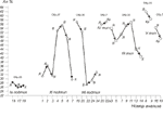 Зерна плагиоклаза подтипа IIб (рис. 4б) имеют основное ядро и более кислые внешние зоны, по составу соответствующие ядрам плагиоклазов I типа (табл. 3). Однако, в отличие от последних, тренд изменения состава плагиоклаза в этих зонах часто имеет обратный характер, т.е. к краю кристалла идет нарастание количества анортитового минала (рис. 5). Границы между ядрами и внешними зонами резкие, состав плагиоклаза на этой границе меняется скачкообразно, содержание анортитового минала при переходе от ядра к внешней зоне падает на 15-25%.