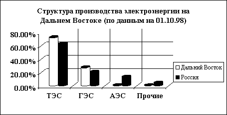 Теплоэнергетика. Тепловые электростанции вырабатывают преобладающую долю всей производимой на Дальнем Востоке электроэнергии. Установленная мощность ТЭС общего пользования составляет 8,8 млн кВт, или 66% всех энергетических мощностей региона. В 1998 г. на долю тепловых электростанций приходилось 72% суммарной выработки электроэнергии на Дальнем Востоке. Основным видом топлива для теплоэлектростанций является уголь. На угле работают все наиболее мощные электростанции региона: Приморская ГРЭС, Сахалинская ГРЭС, Аркагалинская ГРЭС (Магаданская область), Нерюнгринская ГРЭС (Якутия), а также ТЭЦ в административных центрах краев и областей Дальнего Востока. Электростанции региона (за исключением якутских и до недавнего времени амурских) не обеспечены полностью местным топливом, несмотря на значительные запасы энергетических углей во всех регионах. В Хабаровском крае более 80% потребностей в твердом топливе удовлетворяется за счет ввоза из Якутии, Забайкалья, Амурской области и других регионов России. В Приморье доля привозного угля составляет 30%, в Сахалинской области - 13% от общей потребности. Техническую основу теплоэлектростанций составляют турбоагрегаты и энергетическое оборудование российского производства. Максимальная единичная мощность турбоагрегата 215 тыс. кВт.[19,12,13] Гидроэнергетика. На долю гидроэнергетики приходится 21% генерирующих мощностей на Дальнем Востоке и 27% суммарной выработки электроэнергии. При этом за последние семь лет удельный вес дальневосточных ГЭС в производстве электроэнергии вырос на 5 процентных пунктов. Гидроэнергетические ресурсы используются в Амурской, Магаданской областях и Якутии. На территории Дальнего Востока действует шесть ГЭС: Зейская, Колымская, Вилюйская-1, -2, -3, Адычанская. К числу главных гидроэлектростанций относятся: Зейская ГЭС в Амурской области. ГЭС возведена в 650 км от устья р.Зея, левого притока Амура. Ее строительство было начато в 1964 г., пуск первого гидроагрегата мощностью 215 тыс. кВт состоялся в 1975 г. К 1978 г. на станции работало пять генераторов суммарной мощностью 1075 тыс. кВт. В настоящее время установленная мощность Зейской ГЭС 1330 тыс. кВт. Это самая крупная гидроэлектростанция на Дальнем Востоке. Здесь впервые в стране была сооружена крупная массивно-контрфорсная плотина и установлены самые мощные поворотно-лопастные диагональные гидротурбины. Станция оснащена современным оборудованием российского производства и системами автоматики. Площадь водохранилища, образованного плотиной, - 2419 кв. км, емкость при проектном уровне - 68,42 кубических километра. Доля Зейской ГЭС в выработке электроэнергии в Амурской области составляет 76%, в дальневосточном регионе - 12%. Колымская ГЭС в Магаданской области. Станция сооружена у впадения р.Дебин в Колыму. Строительство начато в 1978 г. В настоящее время генерирующая мощность ГЭС составляет 900 тыс. кВт. Колымская ГЭС производит около 80% электроэнергии в Магаданской области. Вилюйская ГЭС в Республике Саха. Станция возведена у пос.Чернышевский, в Мирнинском улусе. Первая ее очередь мощностью 308 тыс. кВт строилась с 1963 по 1970 г. Вторая очередь (340 тыс. кВт) вступила в строй в 1976 г. Емкость водохранилища, образованного плотиной ГЭС, - 35,9 кубических километра. Общая генерирующая мощность станции 648 тыс. кВт, годовая выработка электроэнергии по
