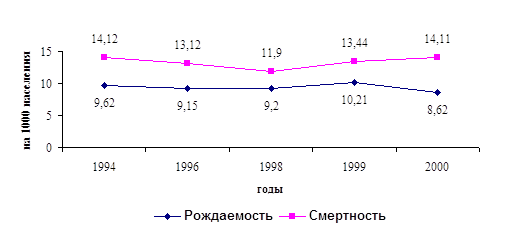 Для региона в целом на сегодняшний день наблюдается естественная убыль, объясняемая значительным снижением рождаемости и увеличением смертности. Разница между этими показателями наглядно представлена на рисунке 3. Рисунок 4. Рождаемость и смертность в Западно-Сибирском экономическом районе в 2000г.