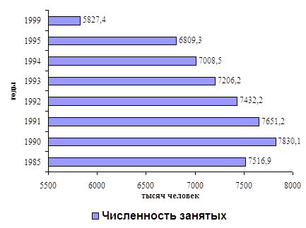 Снижение уровня занятости в 90-х годах отчетливо видно на рисунке 7, построенном на основе данных таблицы 8. Рисунок 7. Изменение уровня занятости населения Западной Сибири в 1985-1999г.г.