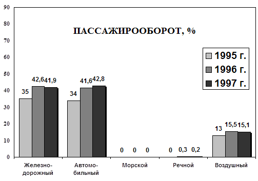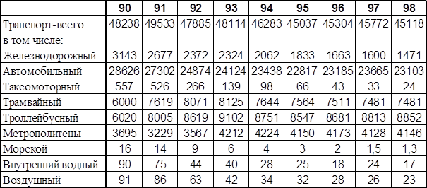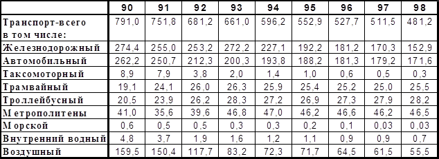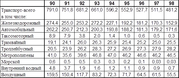 Как видно из диаграммы 2.2.1, первое место по пассажирообороту в 1998 году занимал автомобильный транспорт, его доля составляла 45 %, однако, если не учитывать внутригородские автобусные перевозки, то первенство принадлежит железнодорожному транспорту, доля которого равна 40,2 %. Важное место в пассажирских перевозках занимает воздушный транспорт. Его доля в общем пассажирообороте составляет 14,6 %. Однако в последние годы число пассажиров, перевезённых воздушным транспортом, снизилось почти в 3 раза из-за значительного повышения стоимости проезда и снижения платежеспособности населения. На снижение пассажирооборота сказалось дробление «Аэрофлота» на мелкие авиакомпании, что привело к ухудшению безопасности полётов и качества обслуживания пассажиров. На пассажирские перевозки речным и морским транспортом приходится всего 0,2 %. Сегодня суда морского флота в большей мере используются для туристических целей, речные суда — для перевозки пассажиров на внутренних магистралях в Поволжском, Северо-Западном и других районах страны. За последнее время объём перевозок пассажиров водным транспортом снизился в 3 раза. На рынке транспортных услуг получают развитие отдельные виды пассажирских перевозок: международные воздушные, местные и пригородные автобусные, багажные и грузобагажные железнодорожные. Тарифная политика прежде всего на воздушном транспорте становится более гибкой, усиливается конкуренция между отдельными видами транспорта и пассажирскими компаниями. Таблица 2.2.1 Пассажирооборот по видам транспорта общего пользования[162] (миллиардов пассажиро-километров)