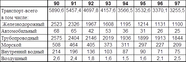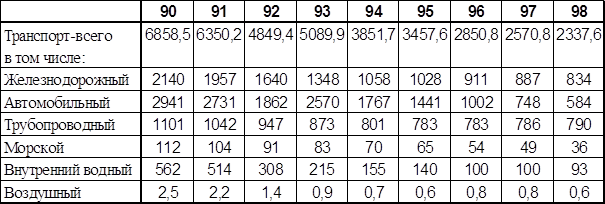 Всего же в 1998 г. пассажирооборот составил 481,2 млрд. пассажиро-километров, что на 30,3 млрд. пассажиро-километров меньше по сравнению с прошлым годом. Из таблицы 2.2.1. видно, что за период с 1990 по 1998 год пассажирооборот постоянно сокращался, и с 1990 по 1998 год сокращение составило 309,8 млрд. пассажиро-километров (791,0 и 481,2 млрд. пассажиро-километров соответственно). Статистические данные ярко свидетельствуют о том, что вся транспортная система Российской Федерации охвачена кризисом. В последние годы имеет место тенденция к падению пассажирооборота на всех видах транспорта. Так, за период с 1993 по 1997 г. пассажирооборот на всех видах транспорта сократился на 27 %, в частности на железнодорожном на 37,4 %, автомобильном на 13,1 %, воздушном на 26,1 % и водном транспорте — 52,6 %. Только в 1997 году впервые за последние годы, пусть и незначительно — на 0,6 %, возросли перевозки пассажиров всеми видами транспорта. Сокращение спроса на пассажирские перевозки вызвано напряжённой социально-экономической обстановкой в стране, снижения жизненного уровня населения, значительным ростом тарифов. Объём международных пассажирских перевозок сократился в результате установления зарубежными железными дорогами высоких цен за проследование российских поездов по их территории, что также привело к снижению спроса на пассажирские перевозки.[163] Работа пассажирского транспорта тесно связана с такими факторами, как подвижность населения, усилившаяся конкуренция между различными видами транспорта, неравномерность и неопределённость спроса на перевозки, убыточность пассажирских перевозок и их финансирование. За анализируемый период общая подвижность населения страны по всем видам транспорта сократилась на18,7 % по числу отправлений, а по количеству пассажиро-километров на 26,2 %, в том числе на железнодорожном транспорте по числу отправлений на 21,6 %, пассажирообороту на 36,7 %. За последние годы из-за снижения жизненного уровня населения значительно изменилась география пассажиропотоков, уменьшилось отправление пассажиров в междугородном сообщении, изменилось распределение их по видам транспорта. Так, за этот период доля автомобильного транспорта увеличилась на 19,1 %. Решая проблему ценовой политики транспортного комплекса, необходимо определять ценовую эластичность спроса разных групп населения на перевозки. Это позволит прогнозировать возможные последствия изменения цен, влияющих на величину их спроса, и сумму дохода от пассажирских перевозок. Так, доходы населения Российской Федерации за период с 1992 по 1997 г. сократились в два раза, пассажирооборот в дольнем следовании — на 41,3 % (т.е. тоже почти в два раза), в пригородном сообщении — на 18,9 %.[164] В грузовых перевозках ситуация выглядит иначе. Ведущее место по грузообороту среди универсальных видов транспорта принадлежит железнодорожному — 32,4%, а на долю автомобильного, морского и речного приходится менее 8% от общего грузооборота. Доля железнодорожного и речного транспорта в общем грузообороте последние десятилетия падает. В то же время доля узкоспециализированного трубопроводного транспорта постоянно увеличивается и в настоящее время составляет 60%. Доля воздушного транспорта в грузообороте крайне незначительна. Но по объему пассажирских перевозок воздушный транспорт занимает третье место. На фоне 1,8 %-го роста 