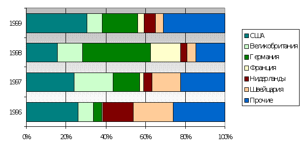 Источник: [Госкомстат России] Значительно увеличились в 2001 году доли инвестиций в торговлю и общественное питание, транспорт и связь, в сферу управления (около 42% всех иностранных инвестиций в 2001 году). Анализ отраслевой структуры зарубежных инвестиций свидетельствует о стремлении инвесторов вкладывать средства в отрасли, дающие либо быструю окупаемость, либо обслуживающие конкретные крупные “точечные” проекты. Структура иностранных инвестиций по странам в 2001 году характеризуется снижением уровня концентрации при сохранении лидирующей роли фирм США и сокращении поступлений из Германии. Вслед за США и Германией с долей вдвое меньше следует Великобритания, за ней: Нидерланды, Швейцария и Франция. В 1999 году активизировались притоки капитала из Азиатско-тихоокеанского региона. По итогам 1999 года Япония вошла в десятку крупнейших стран-экспортеров капитала в Россию. Накопленные инвестиции из Японии в российскую экономику составили 357 млн.долл. В конце октября 1999 года прошло совещание по японско-российскому экономическому сотрудничеству, на котором было отмечено о подготовке к реализации семи крупных совместных проектов, среди которых завершение строительства Бурейской ГЭС и строительство газопровода на Камчатке под кредит ЕБРР. Иностранные инвесторы из других стран в большинстве случаев участвуют в создании совместных предприятий. При формировании небольшого уставного капитала иностранные инвесторы увеличивают долю своего участия за счет предоставления кредитных ресурсов и гарантированного сбыта продукции на мировом рынке, а также продвижения продукции на внутреннем рынке. В качестве приоритетного направления инвестирования европейские компании ориентируются на выбор предприятий обрабатывающей промышленности.