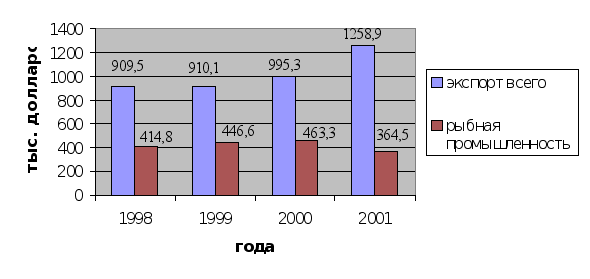 Рассчитано по: [48; 49; 50; 51] Исходя из анализа внешнеторгового оборота Дальневосточного Региона, в последние годы наблюдается рост экспорта и снижение импорта. Хотя в 2001 году импорт и достиг 1017,2 млн. долл. в Дальневосточном регионе и 522,2 млн. долл. в Приморском крае, однако уровня 1998 года (1603,7 млн. долл. и 539,8 млн. долл. соответственно) ни там, ни там он так и не достиг. По данным Примкрайстата экспорт рыбной промышленности за исключением 2001 года составлял примерно половину от общего экспорта Приморского края (Рисунок 2).