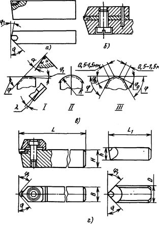 Например, карандаш типа Н марки 4 обозначается так: Н4ГОСТ607-63. Алмазы в оправах. Алмазы с естественными гранями, закрепленные в оправах, имеют преимущество перед алмазными карандашами в том, что изготовляются они из более качественных алмазов, и, следовательно, их износостойкость значительно выше. Алмазные зерна закрепляются в оправах путем зачеканки или пайки. К недостаткам этого вида инструмента относится необходимость перепайки, что связано с большими затратами времени. Для пайки алмазных зерен нашли применение медноцинковые, серебряные и цинковоалюминиевые припои. Ограненные алмазные инструменты Применяются для правки кругов сложного профиля. Изготовляются они в виде резцов с различным профилем алмаза. Стоимость ограненных резцов значительно выше стоимости алмазов в оправах, так как кристалл алмаза ограненных резцов необходимо шлифовать. Однако высокая производительность правки кругов, повышение точности и качества выпускаемых деталей, достигаемые при применении алмазных резцов, полностью оправдывают расходы на правящий инструмент. Рекомендации по выбору алмазного инструмента для правки кругов приведены в табл. 11. Режим правки влияет на износостойкость алмазного инструмента и качество шлифования. Как показали исследования, при правке алмазно-металлическим карандашом марки Ц шлифовального круга ПВД 600Х63Х305 ЭБ40СТ1К при поперечной подаче 0,02 — 0,06 мм/дв. ход, продольной подаче 0,3 — 1,0 м/мин и скорости шлифовального круга 35 м/сек с увеличением продольной подачи от 0,3 до 1,0 м/мин тангенциальная составляющая усилия резания возрастает в 2,7 раза, а износ алмаза—в 2,3 раза. Таблица 11 Выбор инструмента для правки кругов в зависимости от вида фасонного шлифования