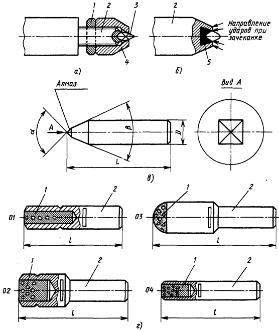 Рис. 3. Инструменты для правки шлифовальных кругов методом обтачивания: а—б—алмаз в оправе, крепление соответственно колпаком и зачеканкой; в—алмазная игла, крепление алмаза зачеканкой или пайкой; г—алмазные карандаши с расположением алмазов цепочкой (01), слоями (02), на сферической поверхности (03), с неориентированными алмазами (04) Правку методами обтачивания производят необработанными алмазами массой 0,2—1 кар 3, закрепленными механическим способом с помощью колпачка 4 и контргайки 1 зачеканкой или пайкой на оправке 2 (рис.3, а). Кроме механического крепления, крепление алмаза в оправке может производиться зачеканкой в медном вкладыше 5, установленном на оправке 2, или пайкой (рис.3, б). Для правки однониточных резьбошлифовальных кругов и правки фасонных профилей по копиру применяют алмазные иглы (рис.3, б), оснащенные спрофилированными алмазами размером 0,1— 0,25 кар. Алмазные иглы имеют угол у вершины «, равный 60° или 90°. Оправку обычно делают с углом b=a-10°, т. е. с углом 50° или 80°. Разнообразие алмазного инструмента по величине, геометрической форме, точности изготовления и чистоте поверхностей и т.д. требует в каждом отдельном случае специальных станков для обработки алмазных кристаллов и приборов для их контроля.