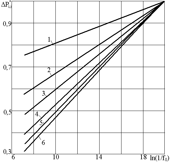 Рис. 1. Поведение относительной депрессии (rc=0,0200, hi=const, f0) при значениях h, равных: 1— 0,1; 2 — 0,3; 3—0,5; 4 — 0.7; 5 —0,9; 6—1,0. где ki — угловой коэффициент прямой, который определяется h и от индекса j не зависит. Анализ зависимости поведения депрессии p*i,j от f0 для всех rc >0,01 показывает, что графики этой зависимости можно описать уравнением пучка прямых для любого значения h. Для rc 0,01 в графиках зависимости появляются начальные нелинейные участки, переходящие при дальнейшем уменьшении параметра f0 (или же при увеличении его обратной величины 1/foj) в прямые для всех значений h (рис. 2). При h=l,0 поведение депрессии строго линейно. Кроме того, протяженность нелинейного участка для разных rc при h=const различна. И чем меньше значение безразмерного радиуса rc , тем больше протяженность нелинейного участка (рис. 2). 2. Определим поведение R(rc, h, f0) и ее зависимость от безразмерных параметров rc, h, f0. Значения R(rc, h, f0) рассчитаны для тех же величин параметров rc, h, f0. которые указаны в пункте 1, обработка результатов также аналогична. Переход от безразмерной функции сопротивления R(rc, h, f0) к относительной R*i,j (rc) осуществлен согласно выражению