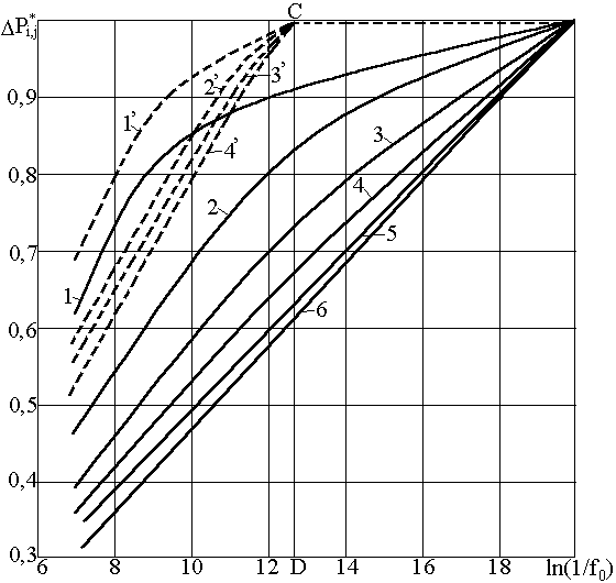 Примечание. При построении принято: — rc=0,10; индекс i=l, 2, ... , 10 соответствует изменению h=0, 1; 0.2; ... , 1,0, a j=l, 2, 3...., — 15—изменению с переменным шагом параметра f0. |
