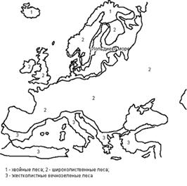 Рис. 2. Межледниковый период: 1 – хвойные леса; 2– широколиственные леса; 3 – жестколистные вечнозеленые леса В течение этого времени Скандинавия представляла остров, отделенный от материка Иольдиевым морем – слившимися Балтийским и Белым морями. По мере потепления климата после схода ледника происходила смена сосновых лесов широколиственными, в которых преобладали дуб, лещина, граб. Таежные леса в Европе произрастали значительно севернее, чем теперь, их южная граница проходила примерно на уровне Лапландии. В северной Европе между «сосновой» и «широколиственной» наблюдалась еще и «тиссовая» фаза, характеризовавшаяся относительно сухим и теплым летом и мягкой зимой. В этот период среднегодовая температура была на 2–2,5° выше современной. В южной Европе около 125 000 лет назад широколиственные леса сменились жестколистными с преобладанием оливкового дерева и жестколистных вечнозеленых видов дуба. 110 000 – 105 000 лет назад Внезапное похолодание. Окончание межледниковья и начало нового (последнего) ледникового периода началось раньше – примерно 115 000 лет назад. В Скандинавии начал формироваться ледниковый щит, который, однако, концентрировался в горах и не доходил даже до северного побережья этого полуострова. Похолодание было еще незначительным, но господство вновь стали получать хвойные породы. Формирование ледника привело к опусканию уровня моря, что вызвало значительные изменения как в растительности, так и в географии материков. В северной Европе широко распространились тундровые сообщества, а в центральной – бореальные хвойные леса (тайга). За этим резким похолоданием последовал длительный период нестабильного климата, в течение которого кратковременные теплые и холодные фазы неоднократно сменяли друг друга. 75 000 – 58 000 лет назад Продолжение похолодания. Прогрессивное похолодание этого времени связано с окончательным формированием ледникового щита, покрывшего всю Фенноскандию и часть материковой северной Европы (Валдайское оледенение). На большей части территории Европы теперь стали господствовать степи и тундростепи. Леса «укрылись» в горах Европы и Малой Азии. 43 000 – 41 000 лет назад Временное потепление. В это время климат очень напоминал современный, но на большей части Европы господствовали степь или лесостепь. 41 000 – 39 000 лет назад. Новое резкое похолодание. Ледниковый щит достиг южного побережья Скандинавии. Растительный покров на большей части Европы представлял собой тундростепь, на значительных площадях разорванную подвижными песчаными дюнами и начинающими формироваться лессовыми отложениями. Среднегодовые температуры этого времени сходны с современными арктическими температурами (–9...–4°С). Температура самого теплого месяца составляла +10...+11°С, что соответствует тем же температурам в современной тундровой зоне. Температура наиболее холодного месяца составляла –20...–27°С. 39 000 – 36 000 лет назад Середина последнего ледникового периода. К этому времени ледниковый щит вышел за пределы Фенноскандии, климат был суше и холоднее современного, а уровень моря на 70 м ниже. Тем не менее это время являет собой пример относительно мягкой для ледникового периода фазы. Южная Европа была покрыта сосновыми лесами, а в центральной и северной частях континента преобладали лесостепь и тундростепь. 28 000 – 25 000 лет назад. 