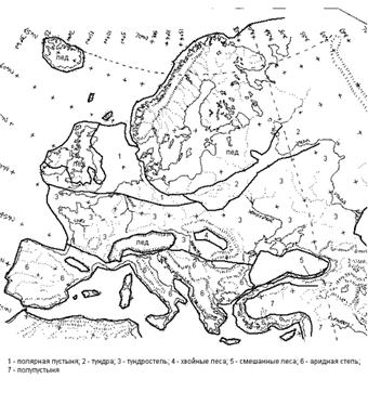 Рис. 5. Период похолодания: 1 – полярная пустыня; 2 – тундростепь; 3 – лесостепь; 4 – аридная степь; 5 – смешанные леса; 6 – полупустыня; 7 – пустыня В течение этого времени средняя годовая температура на 4–9° ниже современной, климат стал более сухим. С большей части Европы лес отступил, и на смену ему вновь пришли степь и тундростепь. Иссушение климата в этот период наиболее резко сказалось на ландшафтах юго-восточной Европы. На Балканах и в Малой Азии создались даже более засушливые условия, чем во время максимума оледенения, – пустынные формы маревых преобладали здесь над полупустынной полынью. Это свидетельствует о том, что годовая сумма осадков не превышала 150 мм. Этот период похолодания внезапно оканчивается 10 000 лет назад. Последующее потепление привело к постепенному исчезновению покровного ледника, и это время принято считать окончанием последнего ледникового периода и началом нового межледниковья – голоцена. 9 000 – 8 000 лет назад В этот период климат в центральной и южной частях континента значительно влажнее современного. Лес снова возвращается в Европу. В восточном средиземноморье появляются широколиственные леса из листопадных видов дуба и граба. В других частях Европы растут леса с преобладанием хвойных пород. 7 000 – 5 000 лет назад Наиболее теплый и влажный период в голоцене (рис. 6).