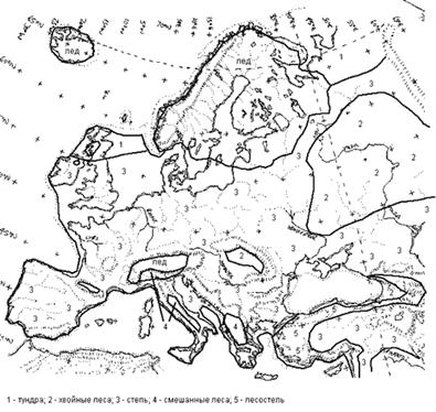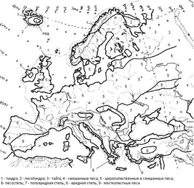 Рис. 6. Наиболее теплый и влажный период в голоцене: 1 – тундра; 2 – лесотундра; 3 – тайга; 4 – смешанные леса; 5 – широколиственные и смешанные леса; 6 – лесостепь; 7 – полуаридная степь; 8 – аридная степь; 9 – жестколистные леса В это время средняя температура июля на широте 50° была на 1 °С выше современной, на широте 60° – на 2 °С выше и к северу от широты 65° – на 3–4 °С выше. Зимние температуры были выше на 2 °С почти по всей Европе. Более теплый, чем ныне, климат позволил лесам далеко проникнуть к северу. Около 6 000 лет назад из-за поднятия уровня моря открылся пролив Босфор и воды Атлантики устремились в Черное море. Возможно, менее чем за 1 год уровень его возрос на десятки метров – вода затопляла берега со скоростью 1 км в день. Было затоплено более 60 000 км2 суши, что составляет около 30% площади Черного моря в его нынешних границах. В рассматриваемый промежуток времени на большей части Европы начинает активно развиваться земледелие. Уже 7 000 лет назад частые пожары в лесах по вине человека привели к широкому распространению пожароустойчивого пробкового дуба. Однако на большей части Европы влияние человека на окружающий ландшафт было еще не столь значительно, как в наше время. Как ни странно, основными местами добычи древесины в то время были не материковые части Европы, а Малая Азия, Крит и многочисленные греческие острова. Последние 5 000 лет Около 4 000 лет назад на ландшафтах западной Европы уже стало сильно сказываться антропогенное влияние. В это же время началось похолодание климата, которое также не могло не сказаться на облике ландшафтов – северная граница леса отступила к югу, усилился рост болот. Другая кратковременная холодная фаза, сопровождавшаяся исчезновением многих теплолюбивых пород на севере, отмечается 1 400 лет назад (около 536 г. н.э.). Этот период очетливо прослеживается по росту годичных колец на поперечных срезах деревьев. Настоящее время Как мог бы выглядеть растительный покров в отсутствие человека. Интенсивная хозяйственная деятельность человека привела к очень существенным изменениям в характере растительности. Из-за регулярных вырубок или полного сведения лесов, распашки земель и выпаса скота, искусственных насаждений различных культур и интродукции новых видов уже трудно решить, в какой степени нынешнее распределение растительности обусловлено климатом, а в какой – вмешательством человека. Возможно ли представить, как мог бы выглядеть растительный покров сегодня при отсутствии антропогенной нагрузки, составить карту так называемой восстановленной растительности? С определенной долей допущения это можно сделать, если проанализировать распределение растительности в местах, еще не затронутых или мало затронутых деятельностью человека, и сравнить его с реконструкциями растительности во времена со сходными климатическими условиями, но до возникновения сельского хозяйства. При этом получается, что современная растительность Европы могла соответствовать той, которая существовала во время климатического оптимума голоцена до начала активной экспансии человека на естественные ландшафты 5 000 лет назад (рис. 6 и 7).