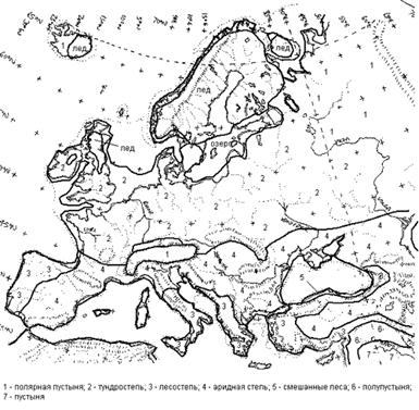 Рис. 3. Последнее оледенение: 1 – полярная пустыня; 2 – тундра; 3 – тундростепь; 4 – хвойные леса; 5 – смешанные леса; 6 – аридная степь; 7 – полупустыня Период наиболее холодного и сухого климата. Южная граница ледникового щита проходила южнее северной Европы. По всей южной Европе средние температуры как лета, так и зимы были на 8–9° ниже современных. На широте южной Германии и северо-западной Украины температура августа составляла примерно +10...+11°С – столько же, сколько сейчас в тундрах Сибири и Якутии. Средняя температура февраля составляла –19 °С на территории современной южной Германии и –27 °С на Украине. Большая часть южной Европы в то время была покрыта холодовыносливой полупустынной растительностью, леса росли лишь в горах на юге. Интересно, что суровые условия не повлияли на популяцию финиковой пальмы (Phoenix theophrastii), сохранившуюся в наиболее теплом тогда месте – на Крите. В средней Европе господствовали тундростепи и полярные пустыни. Повсюду были очень распространены перемещаемые ветром пески. 13 000 лет назад. Резкое потепление (рис. 4).