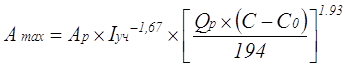где Ар - расчетная нагрузка на забой по технической способности комбайна, т/сут; Ар=1403,48 Iуч - абсолютная газообильность участка, м3/т; Iуч=9,5; Qр - максимальный расход воздуха для проветривания участка определяется по формуле в метрах кубических на минуту Qр=60´Sоч.min´Vmax´kо.з. Sоч.min - минимальное поперечное сечение лавы, м2; Sоч.min=2,5 [5; таб.4]; Vmax - максимальная допустимая скорость воздуха в лаве, м/с; Vmax=4[по ПБ]; kо.з - коэффициент, учитывающий утечку воздуха по выработанному пространству призабойной части лавы; kо.з=1,25 [5, таб.2]; С - допустимая концентрация метана в исходящей струе лавы; С=1% [по ПБ]; С0 - концентрация метана в поступающей струе; С0=0,1 [данные ш. Краснолиманская] Qр=60´2,5´4´1,25=750
