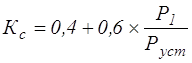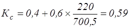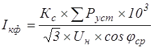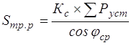 где ∑Руст – суммарная установленная мощность всех потребителей электроэнергии, кВт; ∑Руст=700,5 [таб. 13]; cosφср – средневзвешенное значение коэффициента мощности, потребляемой на участке; cosφср=0,67 [9, стр. 358]; Кс – коэффициент спроса, учитывающий степень одновременности работы и загрузки двигателей, а также КПД кабельной сети и двигателей; определяется по формуле Центрогипрошахта для механизированных комплексов