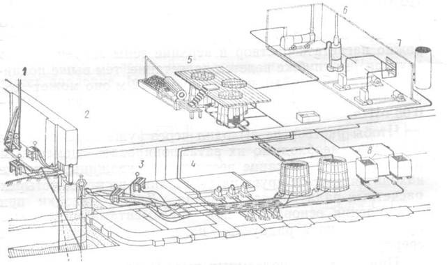 Рис. 1. Схема механизации работ при закреплении грунтов 1 – забивка инъектора электрокором; 2 – то же, пневмомолотом; 3 – пультовые распределители реактива; 4 – насосная; 5 – силикаторазварочный узел; 6 – котельная; 7 – компрессорная; 8 – емкости для растворов CaCl2. Путь раствора хлористого кальция аналогичен пути раствора силиката натрия. Из схемы ясно, что каждый из растворов имеет свое насосное оборудование и свою регулирующую сеть, но один и тот же инъектор. В этом случае перед нагнетанием хлористого кальция необходимо прокачать через инъектор небольшую порцию воды, что в значительной степени предохранит инъектор от образования в нем кремнегеля. Наряду с оборудованием для забивки инъекторов, станками для бурения скважин, насосным оборудованием и разводящей сетью, снабженной манометрами, расходомерами и пр., площадка, где производится закрепление грунтов, должна быть снабжена электроэнергией, водой и' сжатым воздухом. Наконец, производство работ по химическому закреплению грунтов должно быть обеспечено постоянным контролем за качеством применяемых растворов и закрепленного грунта. ИнъекторыКонструкция инъектора и механизма для его погружения в грунт зависит от характера и мощности подлежащего закреплению грунта (рис. 2).