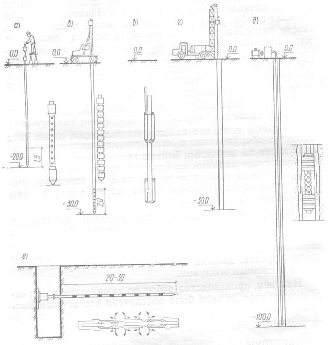 При закреплении грунта на глубину до 20 м применяют инъектор, состоящий из наголовника, колонн глухих звеньев труб, перфорированного звена, наконечника и соединительных частей-ниппелей. Забивку инъектора на глубину до 20 м в песчаные и лессовые грунты можно осуществлять отбойными молотками (рис. 2, а). Закрепление грунтов на глубину до 30 м требует применения более прочного инъектора, сделанного из цельнотянутых труб диаметром 58—62 мм. Перфорированная часть такого инъектора имеет длину 1,5—2,0 м, а отверстия во избежание их засорения закрыты резиновыми кольцами. Погружение таких инъекторов осуществляется более мощным оборудованием (рис. 2, б). Забивку инъекторов выполняют как с поверхности земли, так и из подземных выработок. Для забивки инъекторов применяют преимущественно механизмы, оборудованные пневмоударниками или пневматическими молотками типа перфораторов. Например, используют бурильный станок с пкевмоударником СБУ-100 или НКР-ЮОМ, смонтированный на ходовой тележке СБУ-2 или КБУ-50, а также различные опытные установки типа портативных передвижных копровых установок. Для извлечения инъекторов кроме указанных выше установок можно использовать гидравлические спаренные домкраты грузоподъемностью до 10т. При силикатизации просадочных лессовых грунтов с влажностью 16—20 % инъекцию силикатного раствора плотностью 1,13—1,20 г/см3 можно осуществлять с помощью забивки инъекторов (рис. 2, в) или через стенки пробуренных скважин (рис. 2, г). Для этого бурильным станком ЦГБ-50 проходят скважину глубиной, равной длине первой заходки. Длина заходки в существующей практике составляет 2—3 м. Затем в верхней зоне заходки устанавливают надувной тампон, через который по шлангу от насоса раствор нагнетают в грунт. Затем тампон вынимают из скважины и производят ее бурение на длину следующей заходки. Так повторяют на всю глубину закрепления просадочного лесса. При химическом закреплении песчаных грунтов на глубине 50—150 м, как это было при создании противофильтрационной завесы в основании Высотной Асуанской плотины, нагнетание химических растворов осуществляют через манжетные инъекторы, опускаемые в пробуренную под защитой глинистого раствора скважину диаметром 120—150 мм. Скважину пробуривают на всю глубину закрепляемой зоны, затем в скважину, заполненную глинистым раствором (благодаря чему стенки ее не требуют крепления), погружают инъектор с резиновыми манжетами, закрывающими его отверстия. После этого через нижнюю манжету с применением тампона нагнетают цементно-глинистый раствор, который заполняет зазор между инъектором и стенкой скважины. Этот •вариант позволяет в дальнейшем нагнетать закрепляющий раствор в любой зоне инъектора (рис. 2, д). Манжетный инъектор может быть использован для закрепления грунта под существующими зданиями путем задавливания его из специально подготовленной траншеи (рис. 2, е). Таким образом, применение инъекторов различной конструкции позволяет нагнетать химические растворы на требуемую глубину. Требования, предъявляемые по забивке инъекторовК работам по забивке инъекторов предъявляют следующие требования: 1) инъектор должен быть забит строго по указанному в проекте направлению и с точностью угла наклона 2—3°; 2) забивка должна быть произведена на заданную глубину в возможно короткий срок; 3) при забивке