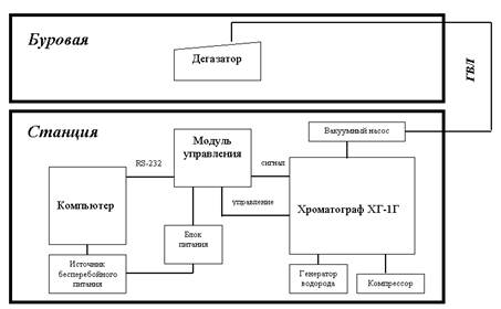 Статья: Газоаналитическая аппаратура для станций ГТИСтатья: Газоаналитическая аппаратура для станций ГТИМахмутов Ш.Я., Муравьев П.П., Артемов Д.В. Газоаналитическая аппаратура (геохимический модуль) станций ГТИ является основной составной частью любой системы геолого-технологических и геолого-геохимических исследований, от технических характеристик которой во многом зависит уровень решения геологических и технологических задач. Высокая информативность геохимического модуля может быть обеспечена при высокой чувствительности хроматографа и суммарного газоанализатора; широком спектре измерения углеводородных газов (УВГ); необходимом динамическом диапазоне измерения УВГ; высокой экспрессности проведения анализов; измерении суммарного содержания углеводородных газов непрерывно в функции времени; регистрации величины концентраций УВГ с учетом калибровочных коэффициентов и коэффициента дегазации желобного дегазатора; возможности регистрации значений УВГ в функции времени и масштабе действующих и исправленных глубин; исключении пропуска маломощных нефтегазонасыщенных пластов и пропластков при неблагоприятных геолого-технических условиях; высокой степени автоматизации процесса измерения; высокой надежности эксплуатации в полевых условиях и простоте в обслуживании. Учитывая изложенные требования к газоаналитической аппаратуре и разнообразие встречающихся геолого-технических условий проводки скважин различного назначения, в НПФ «Геофизика» разработан и изготовлен целый ряд геохимических модулей: хроматографический комплекс ХГ-1ГМ; газоаналитический комплекс «АСТРА»; газоаналитический комплекс «АСТРА-1»; газоаналитический комплекс «АСТРА-2». Хроматографический комплекс ХГ-1ГМ разработан на базе широко известного хроматографа ХГ-1Г. Необходимость разработки такого комплекса обусловлена тем, что в эксплуатации находятся десятки хроматографов ХГ-1Г, которые, обладая целым рядом преимуществ, имеют и существенные недостатки: низкую автоматизацию процесса управления работой хроматографа, сложность и трудоемкость обработки получаемых данных, устаревшую элементную базу, отсутствие выхода на ПК и т.д. При разработке комплекса ХГ-1ГМ были поставлены следующие задачи: полное управление работой хроматографа персональным компьютером; возможность совместной работы с программой регистрации технологических параметров; автоматизация процессов анализа УВГ и обработки результатов; минимальное изменение в конструкции ХГ-1Г в процессе модернизации; возможность дублирования информации на аналоговом регистраторе (аварийный вариант в случае выхода из строя персонального компьютера); высокая надежность и простота в эксплуатации. Структурная схема хроматографического комплекса ХГ-1ГМ показана на рис. 1.