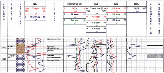 Рис. 2. Пример выделения маломощных нефтенасыщенных пластов по данным ГТИ