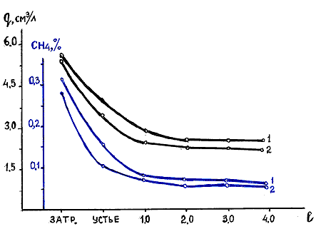 где: Кф – коэффициент опережающей фильтрации; Vп – объем выбуренной породы, см3; Кп – коэффициент пористости горных пород; Кн – коэффициент нефтенасыщенности пород пласта; G – газовый фактор нефти, м3/м3; Q – расход промывочной жидкости, л/с; Vмех – механическая скорость бурения, м/ч; m – мощность пласта, м; qф – газонасыщенность поступающей в скважину промывочной жидкости. Принимая наиболее благоприятный для газового каротажа вариант, т.е. Кф = 1 и Кн = 1, получаем значение газонасыщенности 0,6 см3/л (без учета величины qф ). Данные условия довольно типичны при поисково-разведочном бурении в районах Татарии и Башкирии. При газовом факторе нефти 50 м3/т и механической скорости бурения 40 м/ч, что наиболее характерно для Западной Сибири, газонасыщенность промывочной жидкости будет 97 см3/л. Однако газонасыщенность промывочной жидкости не остается постоянной и резко уменьшается при выходе промывочной жидкости из затрубного пространства в желобную систему и при движении жидкости по желобу. На рис. 1 приведены данные экспериментальных исследований, проведенные Снарским К.Н. по изучению изменения газонасыщенности промывочной жидкости в процессе движения ее из скважины к виброситу. В процессе эксперимента производился отбор проб промывочной жидкости из затрубного пространства до выхода ее на поверхность, на устье скважины и в желобной системе на различных расстояниях от устья скважины (1, 2, 3 и 4 м). Отобранные пробы подвергались термовакуумной дегазации на термовакуумной установке, проводился раздельный анализ извлеченной газовой смеси на хроматографе ХГ-1Г, рассчитывались газонасыщенность промывочной жидкости q углеводородными газами и концентрации метана, этана, пропана, бутана, пентана и гексана.