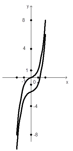 Цель задания — согласовать зрительный образ графика, его геометрические свойства и формулу. График функции у = x2 + 0,3 симметричен относительно оси ординат, значит, рисунок не должен быть скошенным. Его симметричность подчеркивается симметричным расположением «пробных» значений аргумента. Положение точек на чертеже должно выправить распространенную неточность в изображении графиков квадратичных функций: нарисованные от руки ветви параболы, как правило, расположены гораздо шире, чем должны быть. Поэтому пробные точки (их ординаты вычисляются по условию, а не ищутся по чертежу) попадают в полосу между изображенными линиями. То, что графики сближаются по мере удаления от начала координат, требует пояснений, которые можно сделать при обсуждении. К изучению класса кубических функций привлекается прием, аналогичный изучению квадратичных функций, основанный на использовании геометрических преобразований для построения графика произвольной кубической функции из кубической параболы стандартного положения — графика функции у=ах³, а≠0. Как и в случае с квадратичной функцией у=х² видим , что характер изменения значений функции у=х³ неравномерный: на одних участках она растет быстрее, на других — медленнее. Эта особенность выявляется при построении графика, причем целесообразно рассмотреть два графика: один — в крупном масштабе на промежутке,. -1≤x≤1, другой—в мелком масштабе на промежутке, например, -2≤х≤2. Построение можно вести описанным выше методом загущения. Важно отметить свойство кубической параболы - симметричность её графика относительно начала координат.