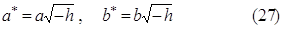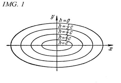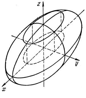 т. е. L*h представляет собой эллипс с полуосями а* и b*, которые могут быть вычислены по формулам (22). Так как Lh получается «подъемом» L*h на высоту h по оси Оz (см. (20)), то и Lh представляет собой эллипс. Представление об эллипсоиде можно получить следующим образом. Рассмотрим на плоскости Оху семейство эллипсов (23) (рис. 1), полуоси а* и b* которых зависят от h (см. (22)), и каждый такой эллипс снабдим отметкой h, указывающей, на какую высоту по оси Оz должен быть «поднят» этот эллипс. Мы получим своего рода «карту» эллипсоида. Используя эту «карту», легко представить себе пространственный вид эллипсоида. (Метод представления формы фигуры путем получения «карты» фигуры я привожу только для эллипсоида, представить форму других фигур этим методом можно аналогично) Наглядное изображение эллипсоида находится на следующей странице. Эллипсоид .
