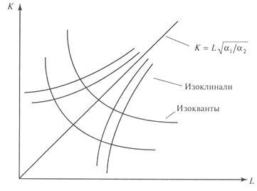 На рис. 1 изображены изокванты и изоклинали мультипликативной ПФ. При изучении факторов роста
