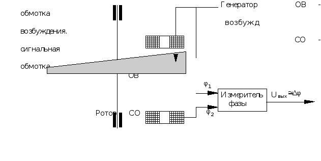 Рис.1. С генератора на ОВ подаётся питающее напряжение. Напряжение на СО отстаёт по фазе от возбуждающего на величину пропорциональную косинусу угла поворота ротора, который выполнен в виде диска переменной толщины. Недостатком данной конструкции является присутствие постоянного сдвига по фазе между сигналами на ОВ и СО, который в данной конструкции зависит не только от свойств материала ротора, но и от радиальных перемещений ротора и частоты напряжения возбуждения. Эту постоянную составляющую необходимо знать заранее и вычитать из полезного сигнала, что вносит дополнительную погрешность в точность установки нуля ДУ. 2) Для устранения влияния свойств материала ротора на уровень нулевого сигнала и устранение постоянного фазового сдвига применяется дополнительная “опорная” обмотка по конструкции аналогичная измерительной. Конструкция такого ДУ приведена на рис.2.