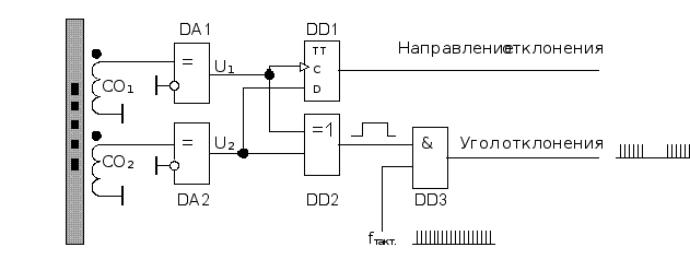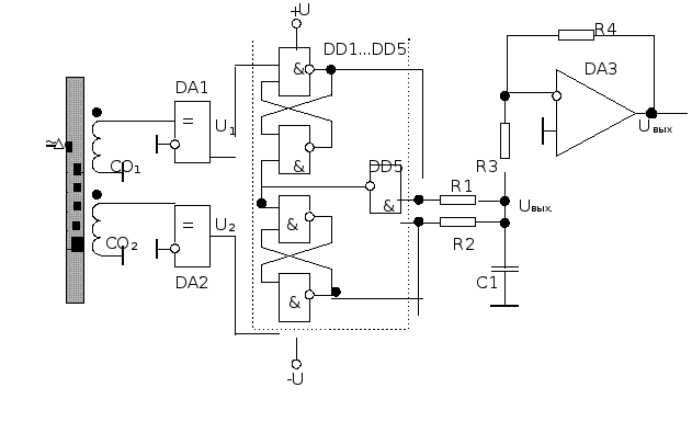 Схема обрабатывает сигнал поступающий с ДУ, конструкция которого представлена на рис.2. Компараторы DA1 и DA2 преобразуют синусоидальное напряжение поступающее с обмоток ДУ в прямоугольные импульсы не изменяя при этом фазу сигнала. Сигнал с обмотки СО1 является опорным. Передний фронт импульса напряжения U1 разрешает переключение триггера DD1 в состояние, определяемое логическим уровнем сигнала U2, знак которого в момент прихода фронта U1 определяется знаком разности фаз напряжений U1, U2. Одновременно импульсные последовательности U1 и U2 поступают на логический элемент DD2 (“исключающее ИЛИ”), на выходе которого дважды за период напряжения питания ДУ появляется сигнал логической единицы, длительность которого пропорциональна разности фаз напряжений U1, U2. Этот сигнал управляет прохождением тактовых импульсов fтакт ,число которых в пачке на выходе DD3 будет пропорционально разности фаз U1, U2 и следовательно пропорционально углу поворота ротора. Данная схема позволяет обрабатывать напряжения U1 и U2, разность фаз которых может изменяться в диапазоне от 0° до 180°. 2) Если выходной сигнал ДУ требуется получить в аналоговой форме, то электронная часть ДУ может быть выполнена, например, по следующей схеме (Рис.4.) [Л15,стр94]. В данной схеме выделение разности фаз напряжений U1 и U2 осуществляется с помощью логических элементов DD1...DD5 совместно с фильтром нижних частот выполненном на R1,R2,C1. Питание на DD1...5 подаётся стабилизированное двуполярное, чтобы обеспечить смену знака выходного напряжения Uвых при смене знака разности фаз. Операционный усилитель DA3 - буферный. Схема позволяет измерять разность фаз U1, U2 в диапазоне ±180°.