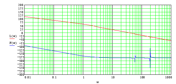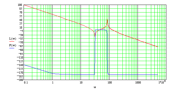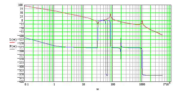 Таким образом, ЛАХ модели с базовыми параметрами: J1 = 0.25 кгЧм2 C01 = 1Ч103 НЧм/рад. D01= 0.001 НЧмЧс J2 = 0.03 кгЧм2 C12 = 1Ч103 НЧм/рад. D12= 0.001 НЧмЧс J3 = 0.01 кгЧм2 C23 = 0 D23=0.1 НЧмЧс J4 = 0.15 кгЧм2 C34 =1Ч104 НЧм/рад. D34=0.001 НЧмЧс J5 = 1 кгЧм2 C45 =1Ч103 НЧм/рад. D45=0.01 НЧмЧс К = 1000 имеет следующий вид.