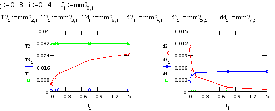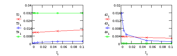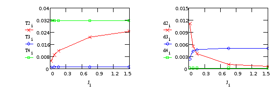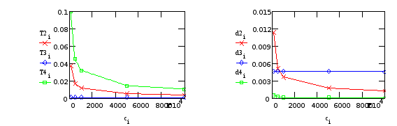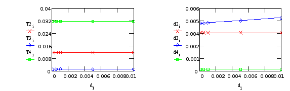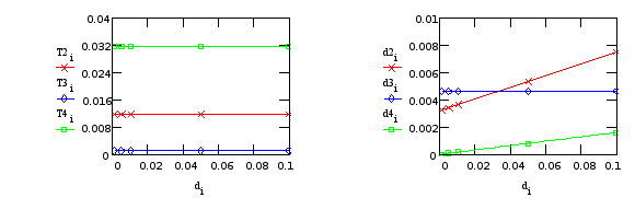 Характер изменения постоянных времени колебательных звеньев Т2, Т3, Т4 и коэффициента демпфирования в этих звеньях, представлен на графиках (Т3, d3 относятся к редуктору; T2, T4, d2, d4 - к креплению телекамеры):