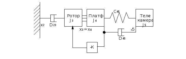 Рис.2. J3 = 0.01 кгЧм2 - ротор; J4 = 0.15 кгЧм2 -платформа; J5 = 1 кгЧм2 - телекамера; C45 =1Ч103 НЧм/рад. - нежесткость крепления телекамеры; D23=0.1 НЧмЧс - демпфирование в двигателе стабилизации; D45=0.01 НЧмЧс - демпфирование в креплении телекамеры; К = 1000 - коэффициент передачи цепи обратной связи. В этом случае уравнения движения модели (1) с учетом того, что x3=x4 имеют следующий вид: (J3+J4)Чx4''+D23Чx4'-D45Ч(x5'-x4')-C45Ч(x5-x4)=-KЧx4 (16) J5Чx5''+D45Ч(x5'-x4')+C45Ч(x5-x4) = 0 Переписав в операторной форме и преобразовав, получим: ((J3+J4)Чs2+D23Чs +D45Чs+C45)Чx4-(D45Чs+C45)Чx5=-KЧx4 (17) (J5Чs2+D45Чs+C45)Чx5-(D45Чs+C45)Чx4=0 Для нахождения передаточной функции разомкнутой системы по управляющему воздействию Wp(s) составим два определителя: главный - D, и характеризующий входное воздействие D1.