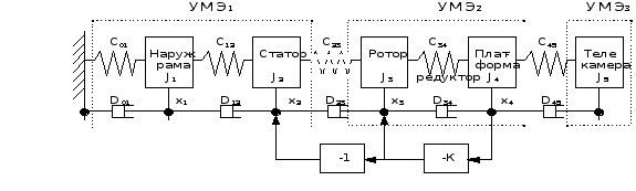 Мy1ин + Мцб Исследование влияния нежесткостей элементов гиростабилизатора на его устойчивость.Анализ устойчивости ГС с нежесткими наружной рамой, креплением статора двигателя стабилизации к раме, с нежесткими редуктором и связью платформы с объектом стабилизации, проводим основываясь на следующей физической модели: