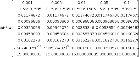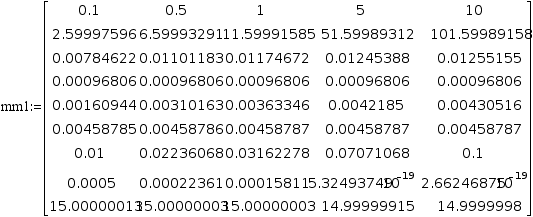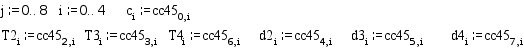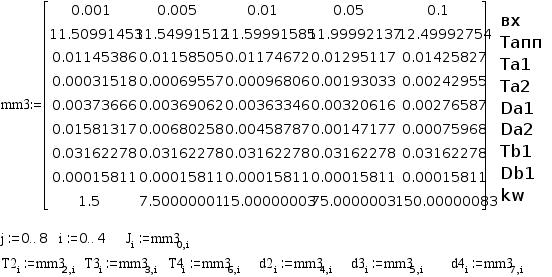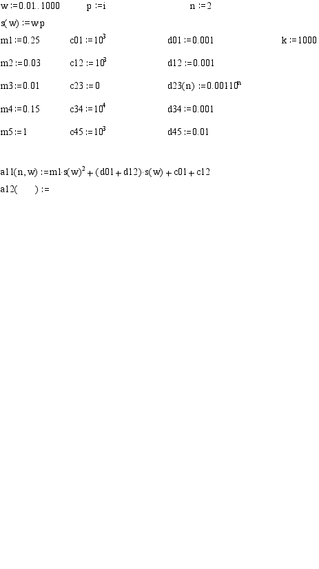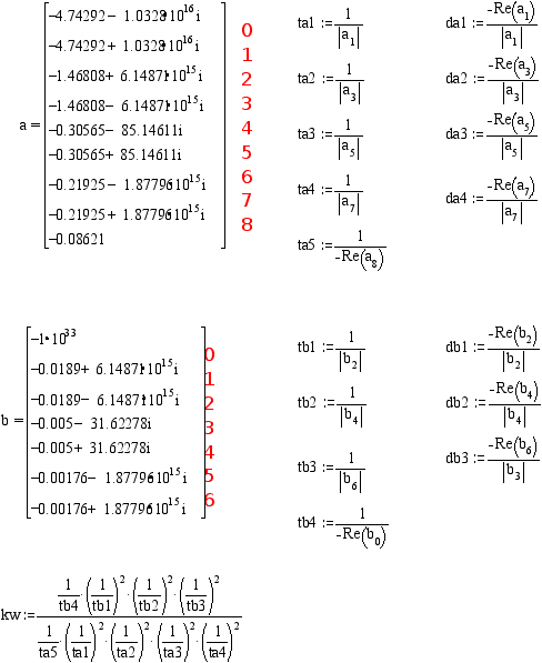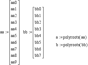 Вычисляю корни полиномов ai , b1 передаточной функции: W(s) = (1/s)*(-K)*((b7*s7+b6*s6 + ... +b0)/(a9*s9 + a8*s8 + ... + a0)) Ввод 0,1,2....9 aa0:=........ aa1:=........ aa2:=........ aa3:=........ aa4:=........ aa5:=........ aa6:=........ aa7:=........ aa8:=........ (....... - выражения для aai, bbi см. записку) aa9:=........ bb0:=........ bb1:=........ bb2:=........ bb3:=........ bb4:=........ bb5:=........ bb6:=........ bb7:=........